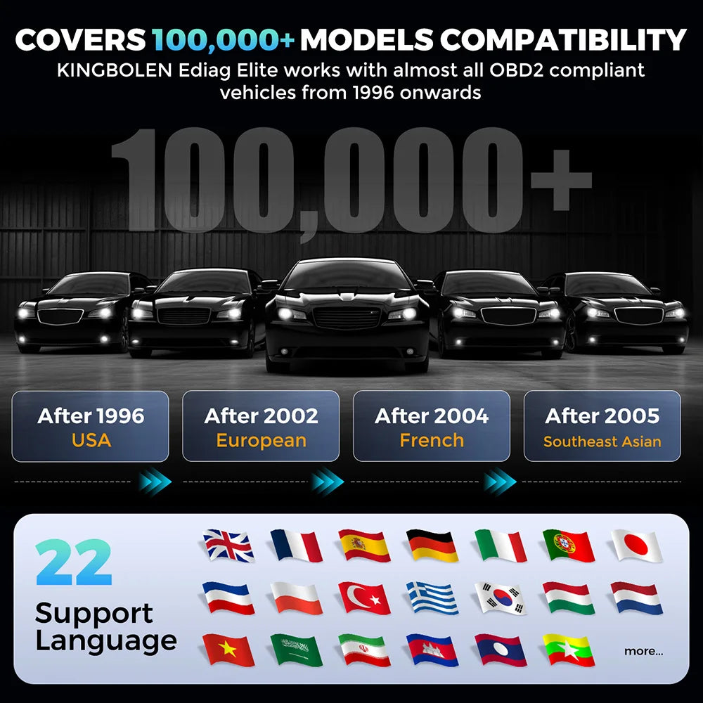 KINGBOKEN Ediag Elite Diagnostic Tool is suitable for Mobile phones, tablet computer that meet the above version information. When the adapter is connected to the car, you only need to detect and diagnose your vehicle through the mobile phone's Bluetooth 4.2 and APP. It is suitable for most DIY car owners and maintenance and repair car stores on the market.