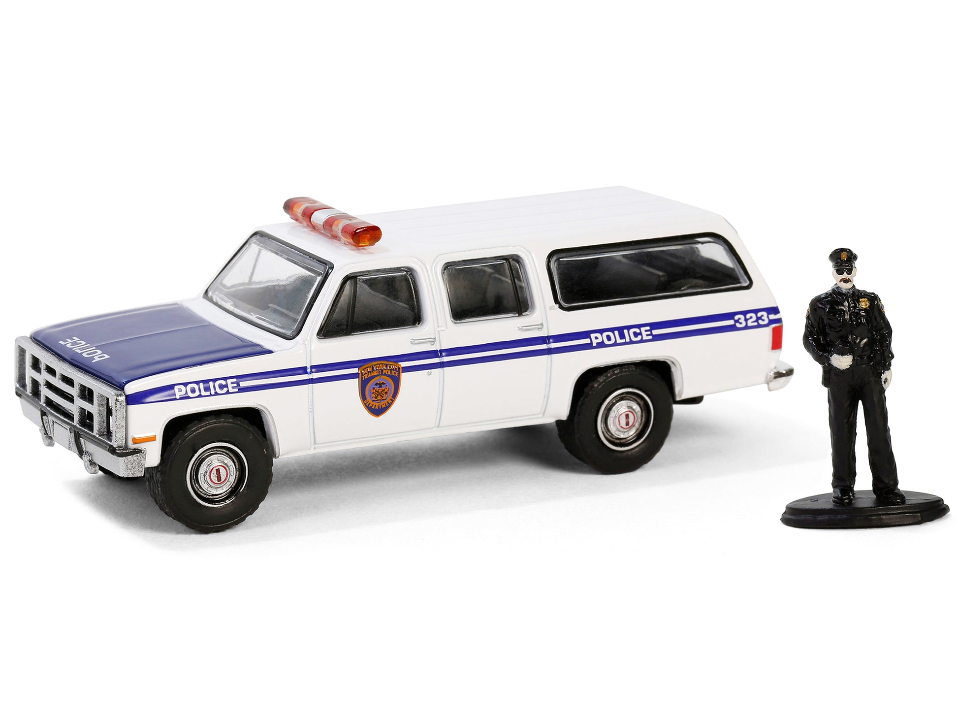 - Brand new 1/64 scale diecast car model of 1985 GMC Suburban 2500 "New York City Transit Police Department" White with Blue Stripes and Police Officer Figure "The Hobby Shop" Series 16 die cast model car by Greenlight.