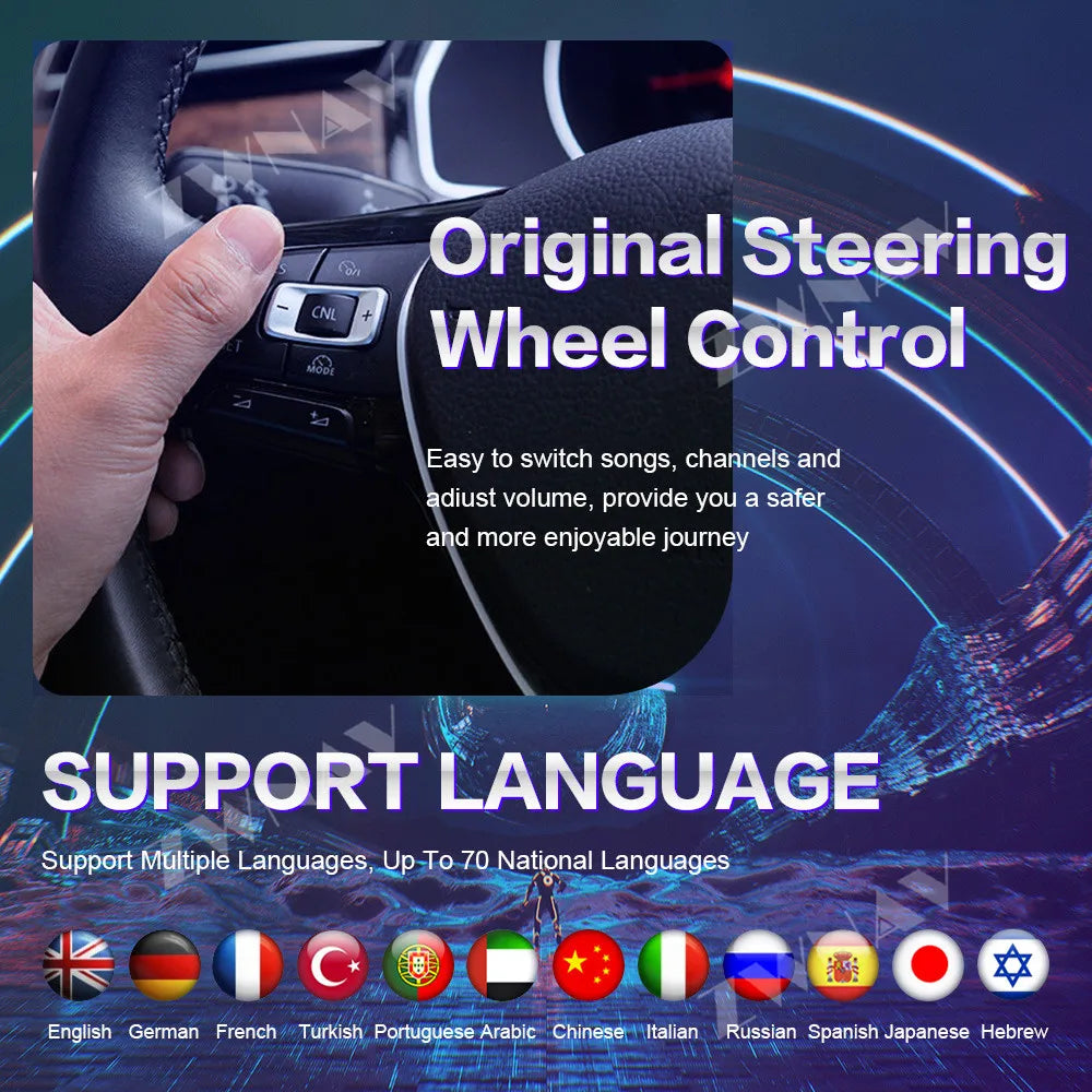 10.Support Steering Wheel Control 11.OSD Language: English / Russian / French /German / Spanish / Italian / Arabic / Portuguese /Turkish / Thai / Polish / Hebrew all 53 language.