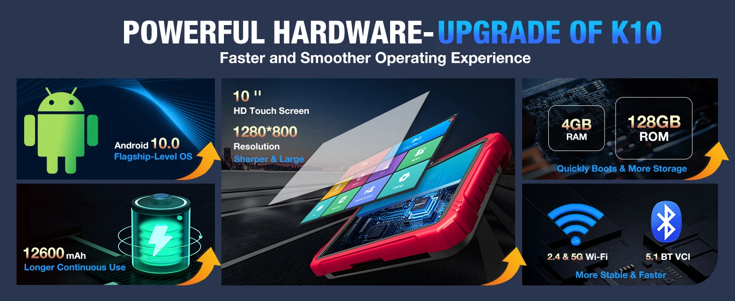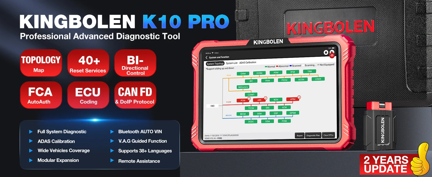 it have Outstanding Hardwares&Newest Functions;The KINGBOLEN K10 Pro car scanner performs many advanced functions, including Full System Diagnostics, Topology Map, FCA AutoAuth, ECU Coding, Bi-Directional Control, 41+ Reset Services,and added CAN FD & DoIP Protocols ect. Equipped with a 10'' HD screen, 1280 * 800 Resolution, Android 10.0 OS, 4GB RAM+128GB ROM, 12600mAh/3.85V Battery, Rear Camera 8.0MP, and Magnetically Fixed VCI.