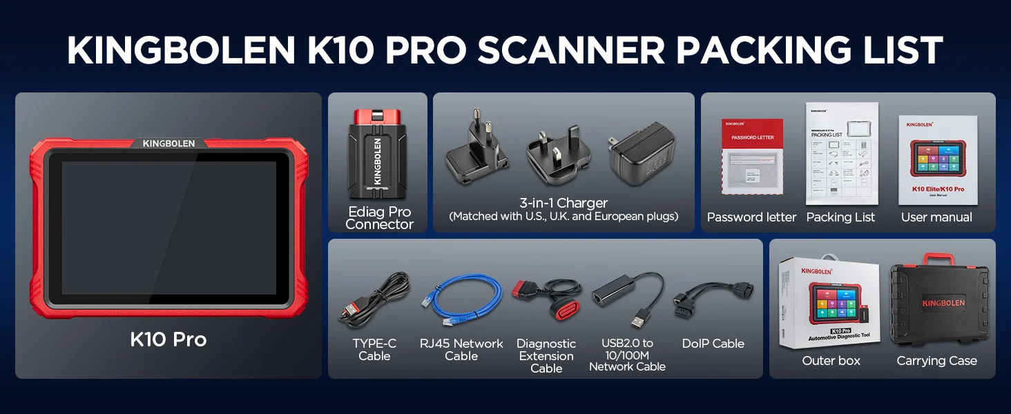 The KINGBOLEN K10 Pro car scanner performs many advanced functions, including Full System Diagnostics, Topology Map, FCA AutoAuth, ECU Coding, Bi-Directional Control, 41+ Reset Services,and added CAN FD & DoIP Protocols ect. Equipped with a 10'' HD screen, 1280 * 800 Resolution, Android 10.0 OS, 4GB RAM+128GB ROM, 12600mAh/3.85V Battery, Rear Camera 8.0MP, and Magnetically Fixed VCI. Upgraded version of K10,more cost-effective, better choices.