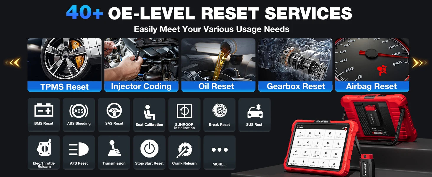 KINGBOLEN K10 Pro Comes with 41+ common special functions & advanced Reset, Relearn, Matching, Calibration and Adaption functions, such as: ABS Bleeding, Injector Coding, Oil Reset, EPB, Camshaft Position Sensor Relearn, Cam Crank Relearn, Calibration, Fuel Trim Reset, etc, makes for an excellent all-in-one diagnostic scanner for professional auto maintenance.