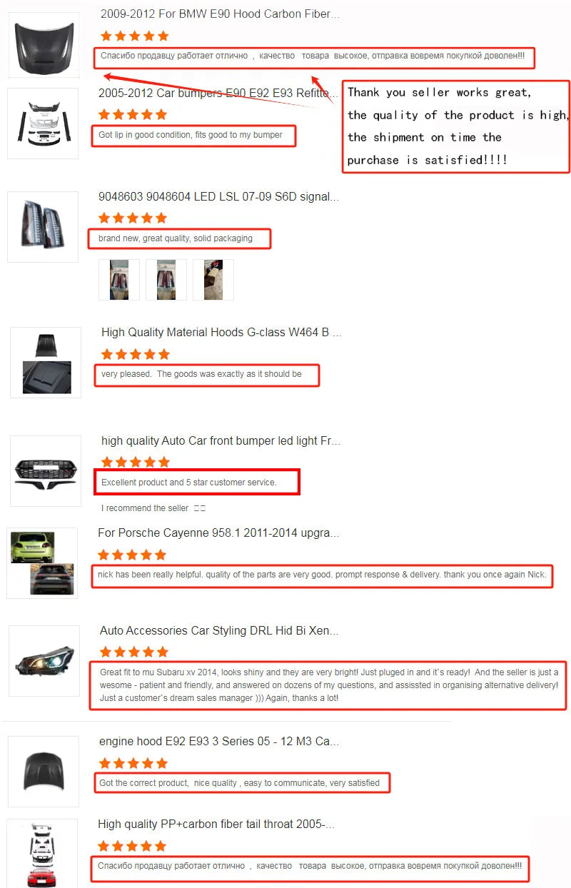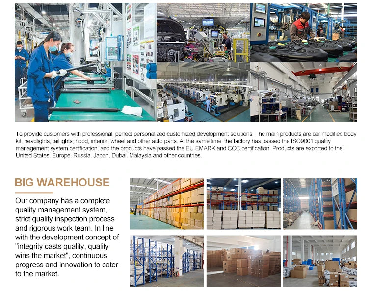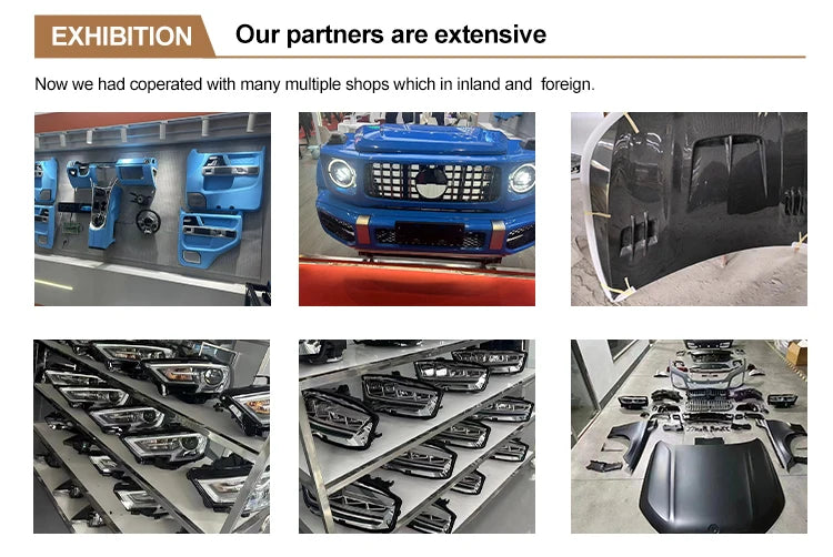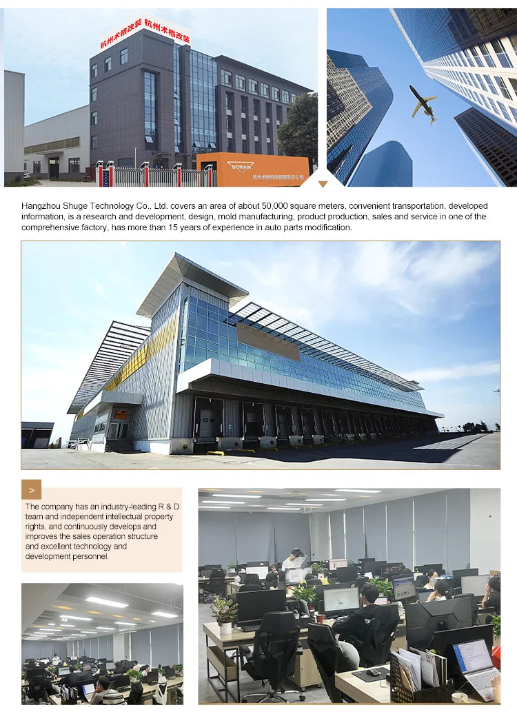 1. Why buy from us instead of other suppliers? Hangzhou shuge Technology Limited Liability Company, covering an area of about 50,000 square metres, with convenient traffic and developed information, is a comprehensive factory integrating research and development, design, mould manufacturing, product production, sales and service, with more than 15 years of experience in auto parts modification. The company has the industry's first-class R & D team and independent intellectual property rights and continue to develop and improve the sales operation structure and excellent technical and development personnel. We provide customers with professional and perfect personalised custom development solutions. 2. How do we guarantee the quality? After the products are manufactured, we will put them into the warehouse after three times of testing and inspection. One year warranty 3. Who are we? Our headquarter is located in Binjiang, Hangzhou, China. Since 2010, our products have been sold to the United States, Europe, Southeast Asia, Africa and many other countries. 4. what can you buy from us? All kinds of car body kits, car bonnets, headlights and taillights, car accessories, car wheels and so on. 5. What services can we provide? Accepted delivery terms: FOB, CFR, CIF, EXW, DDP; Accepted payment currency: USD; Accepted payment methods: T/T, L/C, PayPal, Western Union, Escrow. 6. How do you handle customer complaints? We will reply to customers quickly within 1 hour during working hours. 7. 7. What is your sample policy? If we have stock, we can provide samples, but users need to pay sample fee and shipping fee! 8. How do you keep good long term relationship with our business? We maintain good quality and competitive price to ensure the benefit of our customers; We respect every user, treat them as friends, and do business and make friends with them sincerely, no matter where they come from. 9. What are the conditions for product customisation? We accept a small amount of customisation and support users to provide samples OEM No. Customised products need to be paid in advance, with a minimum prepayment of not less than 30%.