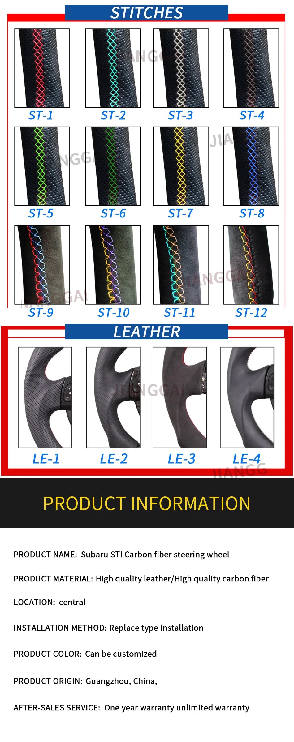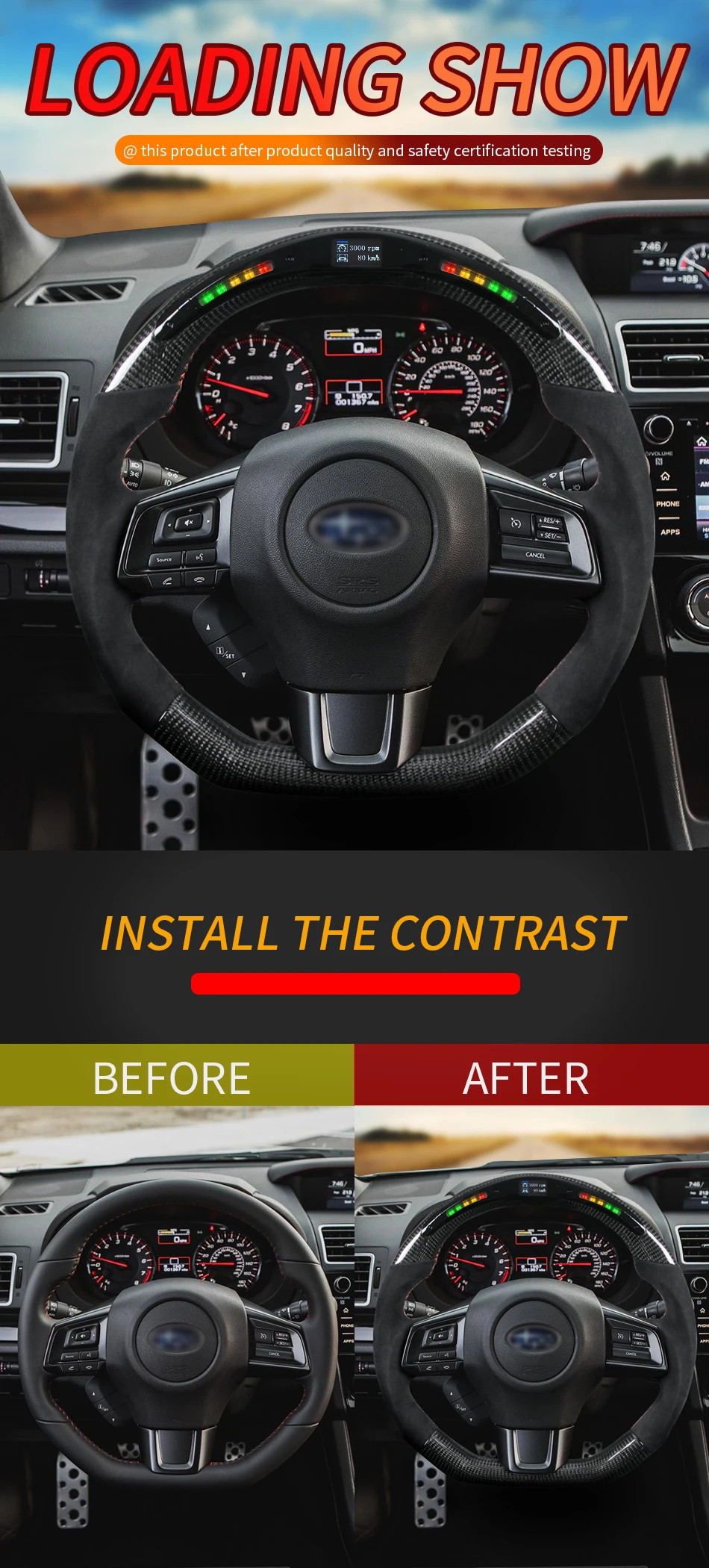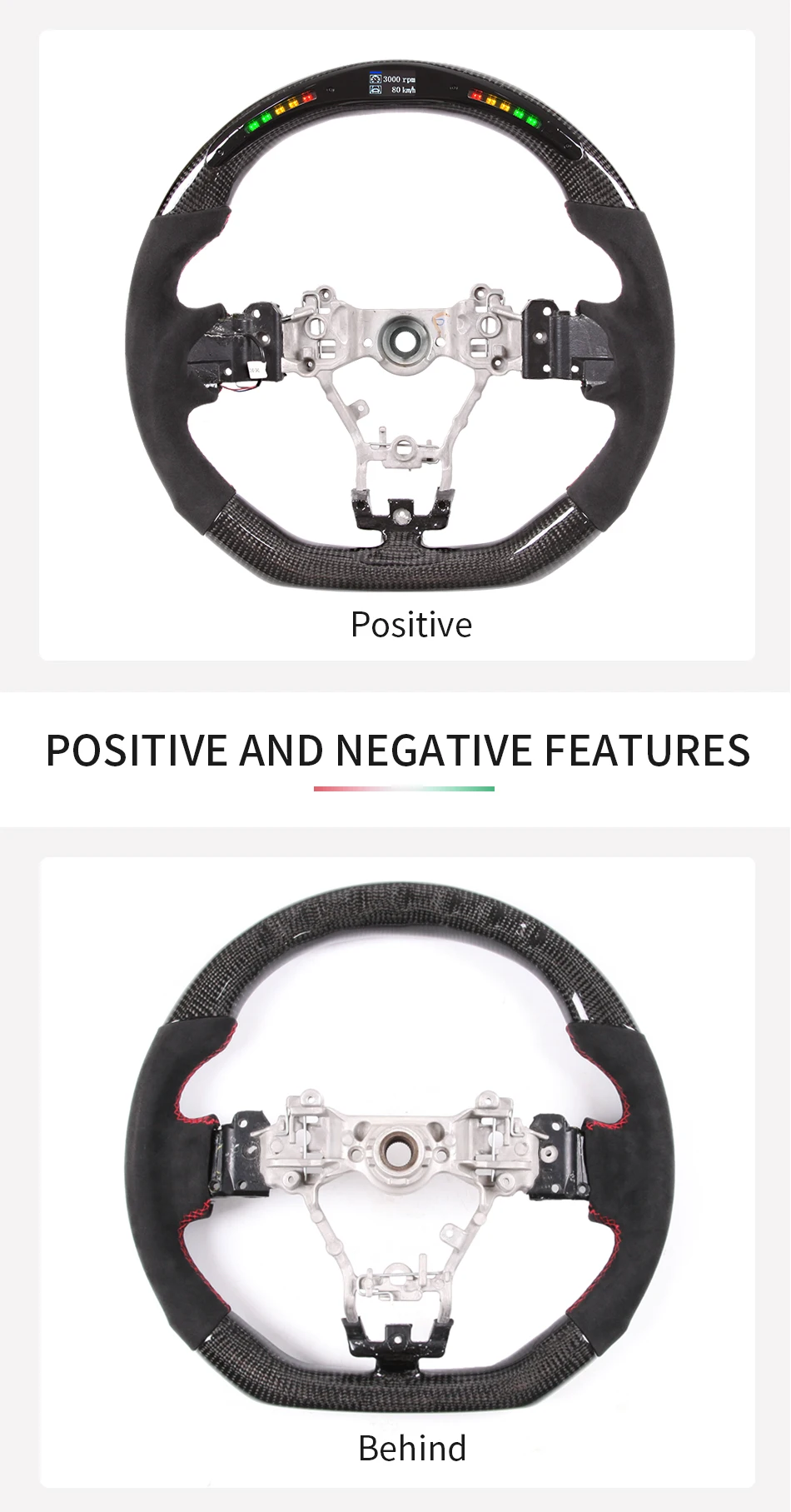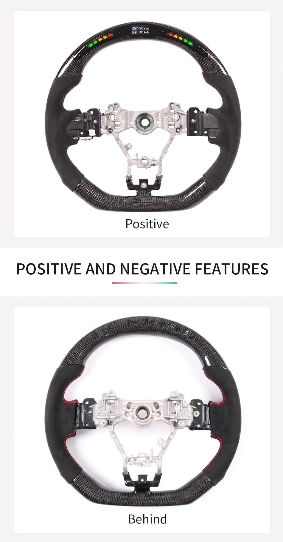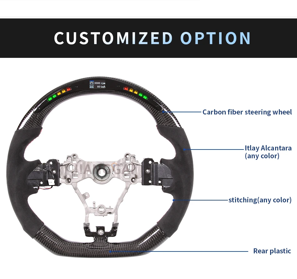 LED product advantages Imported LED lamp beads, high temperature resistance, long life, full HD, no dead spots, detachable LED lamp set, easy to repair and maintenance, customized boot LOGO, OBD-2 module data transmission is stable and fast, easy to install, suitable for a wide range of models, instrument information Function display, turn signal reminder, danger light reminder, etc. Product List: 1、LED steering wheel core + rear plastic ( not include airbags, dial keys, buttons, decorative covers) Product style: If you need other customized products, welcome to contact our customers, the general customization time is 15 working days Technical Parameters Working voltage: 12V-16V Working current: main board<40mA/display<25mA Quiescent current: 3mA Applicable temperature: -40℃~+85℃ Working frequency: 2.4GHz Sensing distance: 10m The main function 1. Fuel consumption breakdown 2. Steering wheel angle perception 3. Dynamic steering transmission 4. Time record 5. Dynamic speed sensing 6. Racing mileage record 7. Engine information presentation 8. Specific information setting 9. Estimated mileage 10. Turbo display Features 1. Brand new design, no broken wires and plug-in installation 2. Dual-core design, low power consumption and more reliable 3. 2.4G wireless frequency hopping technology is more stable 4. Realize human-vehicle interaction 5. Car-level quality Style: Material:Led steering wheel Condition: 100% brand new Commodity type: steering wheel Applicable object: Subaru sti/ wrx 86 brz 2015-2021 note: The steering wheel does not include airbags, dial keys, buttons, decorative covers.
