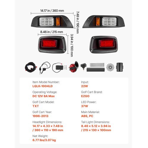 LED Power: 37W,Headlight Dimensions: 11.42 x 5.12 x 5.31 in/290 x130 x 135 mm,Golf Cart Model: DS,Golf Cart Model Year:1996-Up,Input Power: 22W,Voltage & Current: DC12V 8A Max,Item ModelNumber: LQLK-2002LD,Net Weight: 6.48 lbs/2.94 kg ,Golf Cart Brand:Club Car,Main Material: ABS, PC,Tail Light Dimensions: 6.1 x 4.13 x2.17 in/155 x 105 x 55 mm