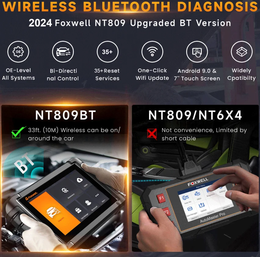 Foxwell NT809BT auto diagnostic scan tool can access (both wirelessly and wired) and scan all available electronic systems on perform full diagnostics to read and clear codes, view live data stream of multiple sensors in text or graph, retrieve ECU information, such as ECM, TCM, ABS, Airbag, BCM, Parking/ Steering/ Suspension/ Radio, Lighting/ HVAC systems, etc.