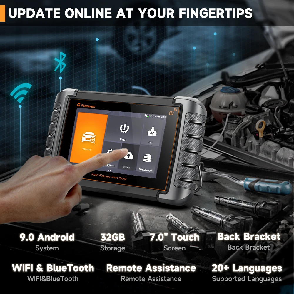 Foxwell NT809TS auto diagnostic scan tool can access (both wirelessly and wired) and scan all available electronic systems on perform full diagnostics to read and clear codes, view live data stream of multiple sensors in text or graph, retrieve ECU information, such as ECM, TCM, ABS, Airbag, BCM, Parking/ Steering/ Suspension/ Radio, Lighting/ HVAC systems, etc.