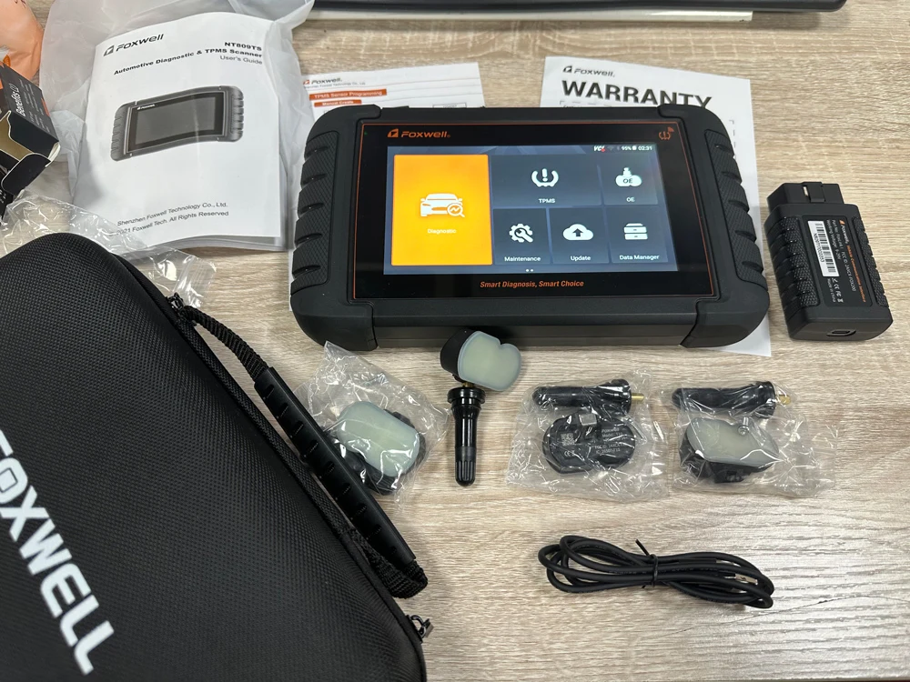 FOXWLEL NT809TS= Bidirectional Scan Tool+ All System Diagnostic Scanner+ 30 Service Reset Tool+ TPMS Programming Tool+TPMS Relearn Tool+ 4 pcs TPMS Sensor+Wireless Dongle