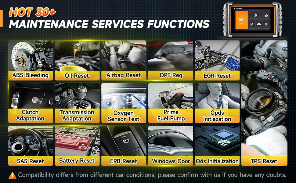 Else: Seat Match/ Language Change/ TPMS Reset/ E-G-R Adaption/ Headlamp Reset/ Cluster/ Clutch Adaptation/ CVT/ EVAP Test/ Gear Learn/ ODS & OPDS/ Oxygen Sensor Test/ Prime Fuel Pump/ TCM Oil/ Transmission Adaptation/ T-U-R-B-O/ Windows-door etc.