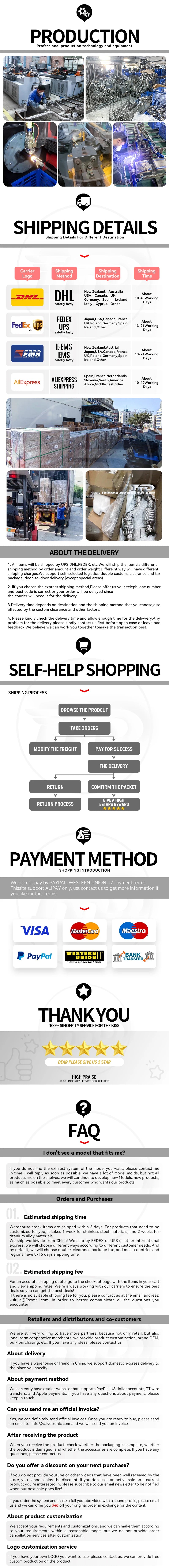 Production time: except for stock products, after payment: Downpipe 7-10 days, stainless steel material 7-10 days, titanium alloy material within 15-20 days.