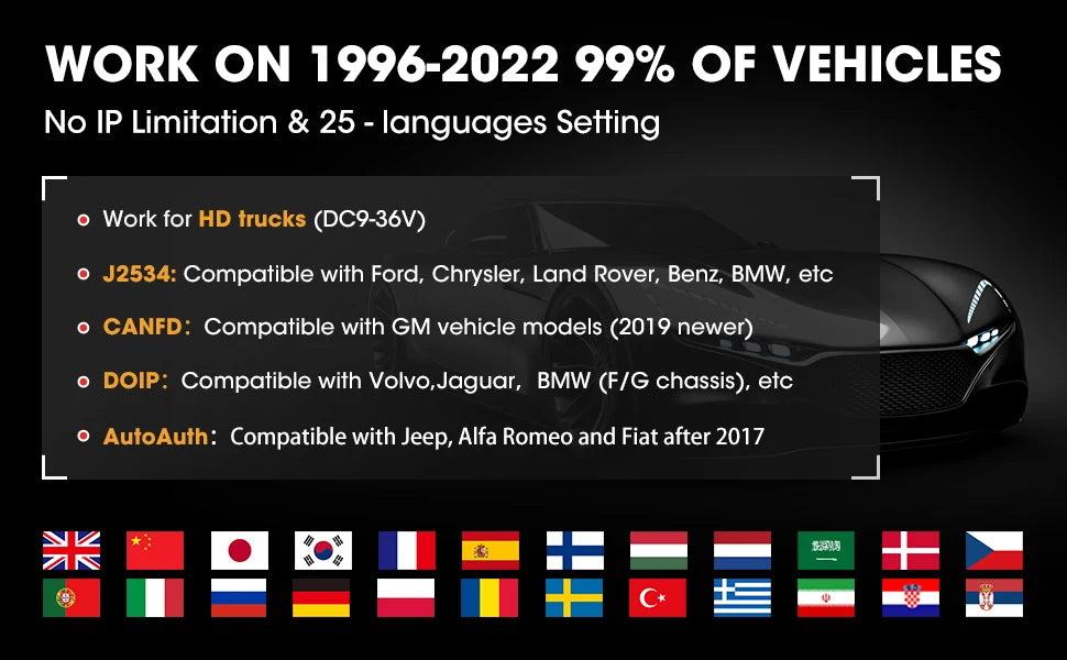 OE-Level car coverage. Support Heavy Duty Trucks with heavy-duty software. 100+ car brands, 20,000+ models from the US, European, and Asian car markets; still expanding.