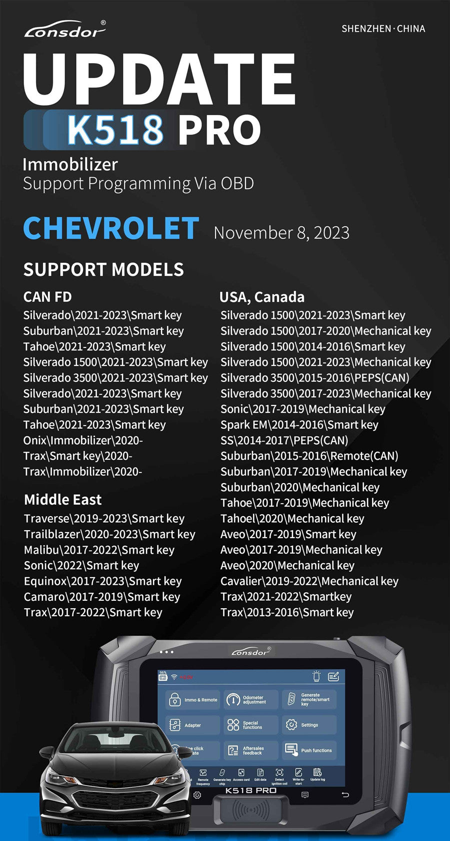 Lonsdor K518PRO for CHEVROLET UPDATE Support Programming Via OBD: