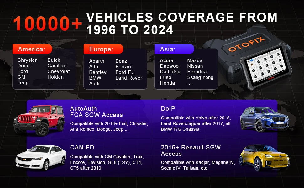 OTOFIX D1 Lite is equipped with the V1 Bluetooth connector, which supports CAN-FD and DOIP. This automotive diagnostic scanner supports compatibility with GM Cavalier, Trax Encore & Volvo after 2018, LanRover/Jaguar after 2017, and more. It can work on over 99% of worldwide vehicles from diverse brands, even some luxury brands e.g. compatible with Maserati, Ferrari, Mercedes, etc.