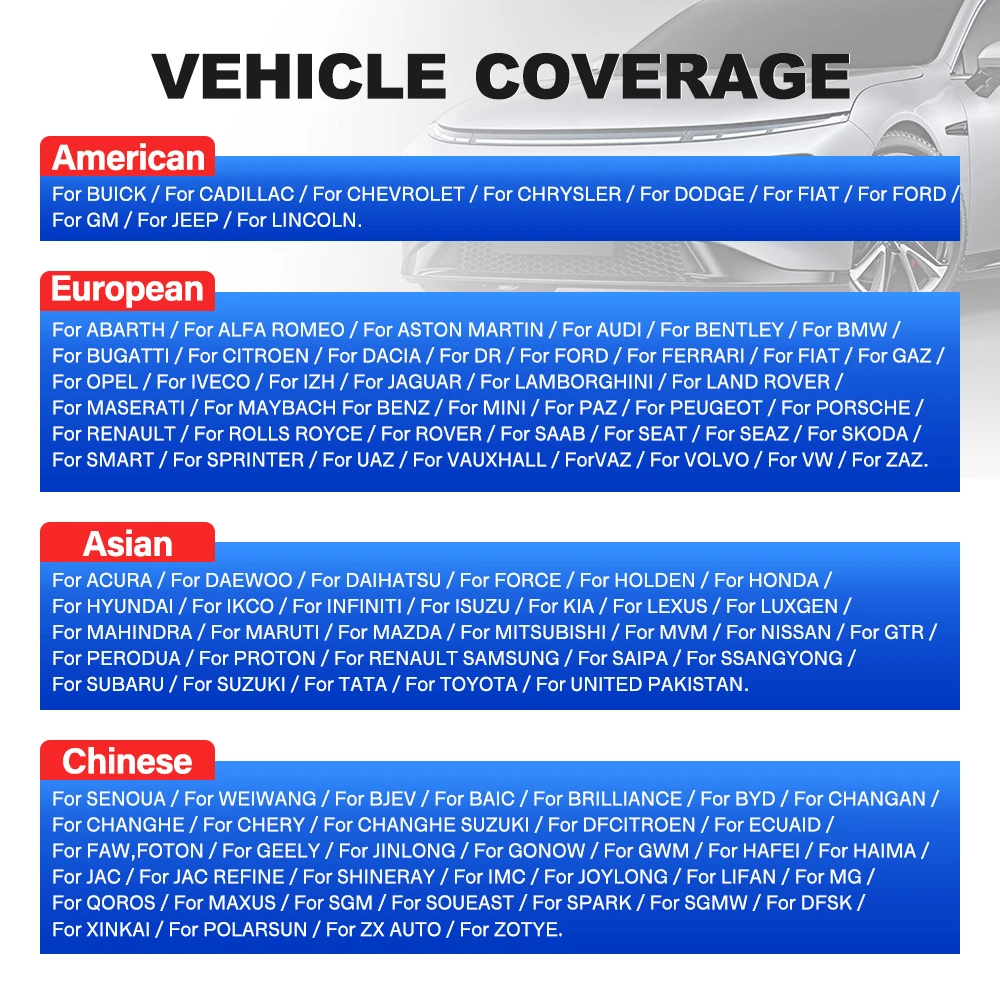 For instance: Engines/Transmission/Airbags/Immobilizer/Key Coding/ABS/Cruise Control/Instruments/ Self Leveling Suspension systems/Seats/Doors/Gateway/Steering Angle/Air Suspension/Body Systems/Electronic Power Steering & Motor Assisted/Power Steering/Tyre Pressure/Rain Sensors/4WD System/Stabilizer/Intelligent Parking Assist/Door Motors/Audio Systems/Air Conditioning/Tiptronic/Anti Theft/Soft Top/Headlamp Leveling/Central Locking/Automatic Clutch/ DPF Reset/Electric Windows/Plip Programming/Heated Rear Window/Xenon Headlights/Wash Wipe/Fuel Burning Heater/Transfer Box/Seat Memory/Oil Life Service Reset/Sliding Doors/Electronic Throttle/Navigation System/Rollover Sensor/Cruise Control/ Multi Function Steering Wheel/Aux Heating/Electronic Parking Brake/Clutch Electronics and etc.
