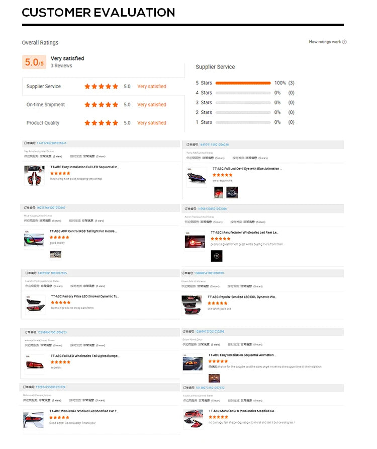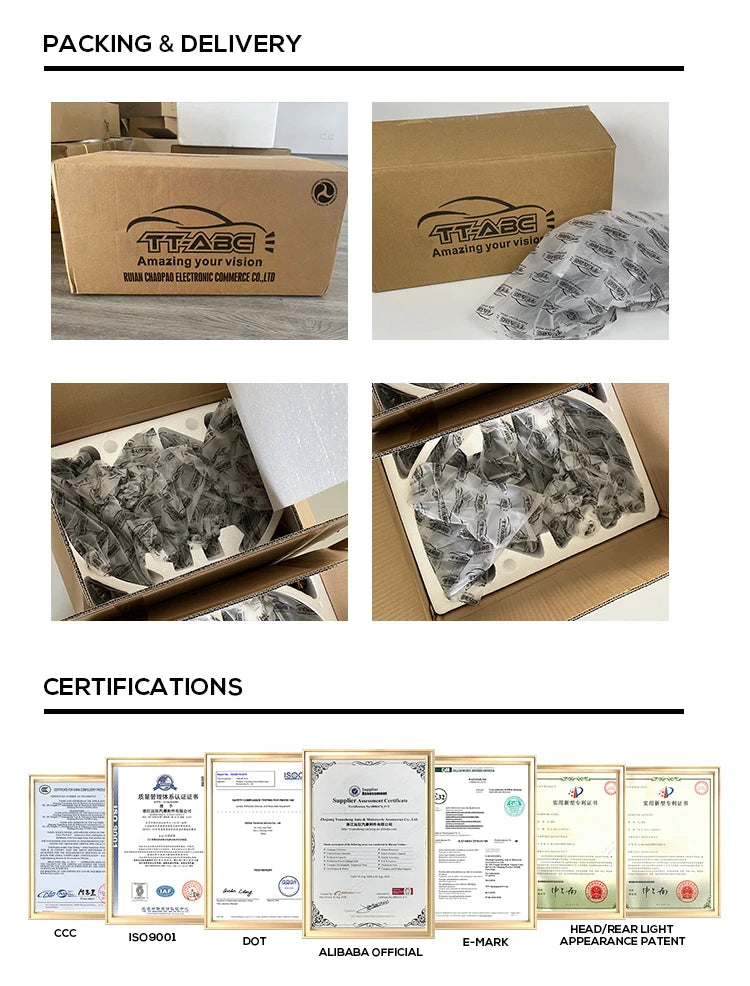 Ruian Caopao Electronic Commerce Co., Ltd. is a leading manufacturer of automotive modification lights in China. Our company specializes in the production and distribution of high-quality automotive lighting products under the brand name TT-ABC. With a strong commitment to innovation and technological advancements, we strive to deliver cutting-edge lighting solutions to enhance the aesthetics, functionality, and safety of vehicles. Our extensive range of products includes LED headlights, taillights, fog lights and various other lighting accessories. At Ruian Caopao Electronic Commerce Co., Ltd., we prioritize customer satisfaction and aim to exceed their expectations by offering superior products and excellent service. Our team of skilled engineers and technicians ensures that each product undergoes rigorous testing and adheres to international quality standards. We understand the unique needs of automotive enthusiasts, car modification shops, and OEM manufacturers. Therefore, we provide customized solutions and flexible manufacturing options to meet diverse requirements. Our state-of-the-art production facilities and stringent quality control processes enable us to deliver products that combine exceptional performance, durability, and style. As a socially responsible company, we are committed to environmental sustainability. We strive to minimize our ecological footprint by implementing eco-friendly manufacturing practices and utilizing energy-efficient technologies. With a strong distribution network, our products are available nationwide and exported to various international markets. We have established long-term partnerships with distributors and retailers, ensuring convenient access to our range of TT-ABC automotive lighting products. At Ruian Caopao Electronic Commerce Co., Ltd., we are dedicated to driving innovation in the automotive lighting industry. With our relentless pursuit of excellence, we aim to become a trusted global brand, synonymous with superior quality and exceptional performance. For more information about our company and products, please visit our website or contact our sales representatives.