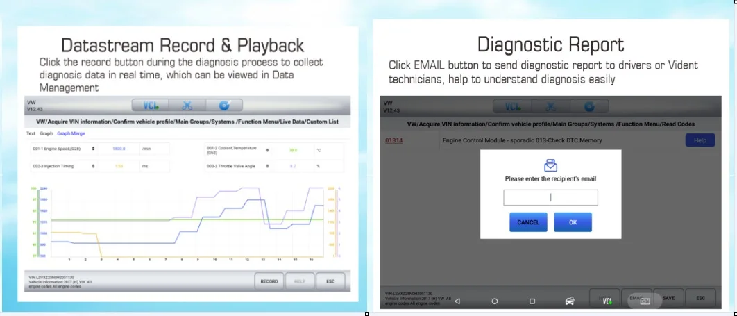 Click EMAIL buttom to send diagnostic report to driver or Vident technicians,help to understand diagnosis easily.